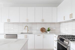 White cabinets show dirt and dust more than other types of cabinets and need more particular cleaning. The best way to keep white cabinets clean and remove surface-level stains is to wipe them frequently with a cloth and warm water. For deeper cleans, use a combination of dish soap and warm water.