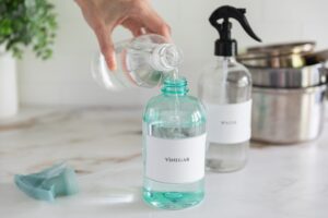 - Fill a spray bottle with one part cleaning vinegar and two parts water.